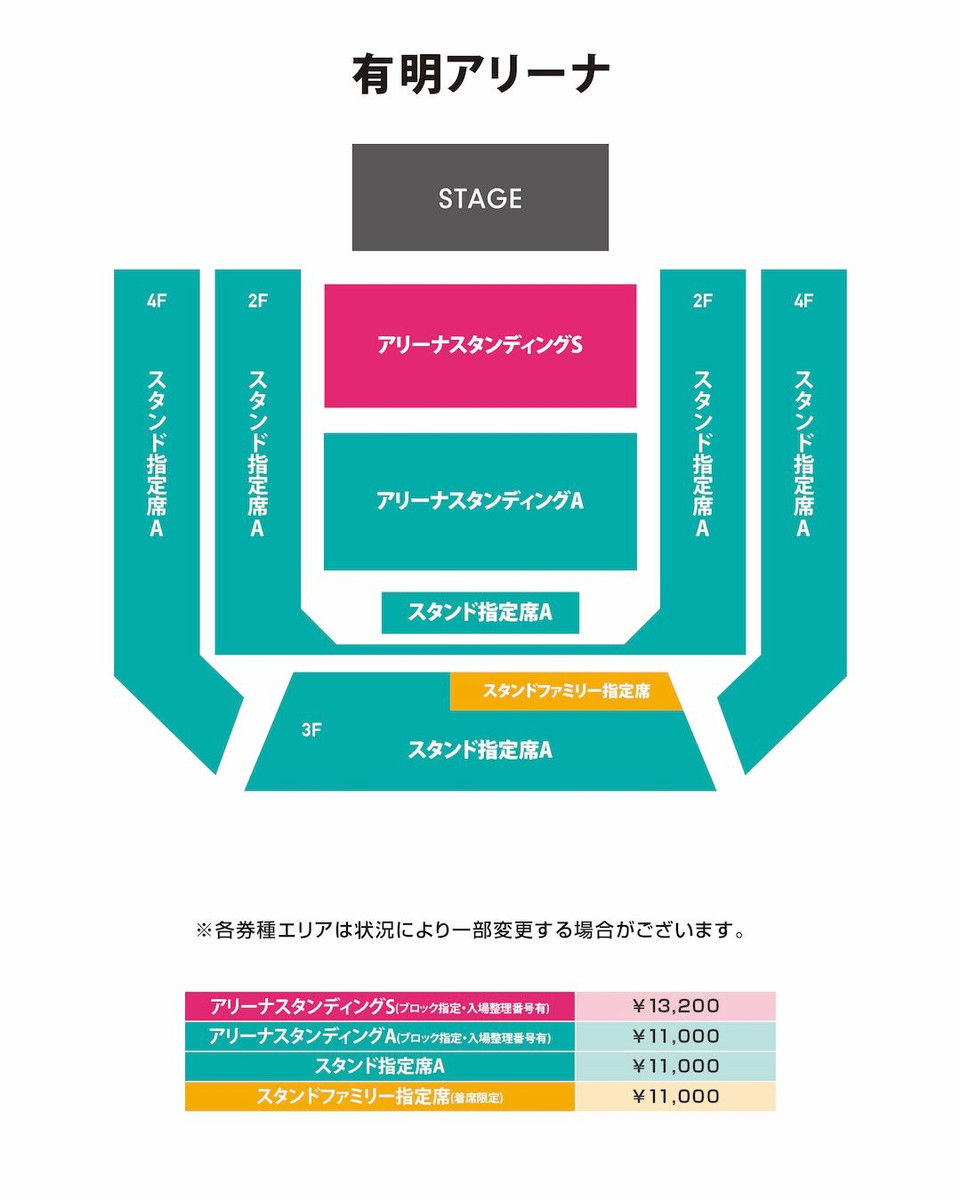 ※アリーナスタンディングS/アリーナスタンディングA/スタンド指定席Aは2枚まで。スタンドファミリー指定席は4枚まで。